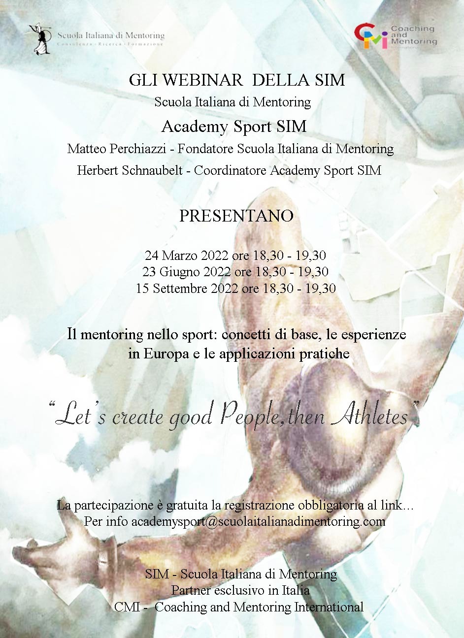 E' il secondo evento gratuito della Academy sport SIM,  la prima Academy del Mentoring interamente dedicata allo sport. Prima di partire con i corsi della Academy Sport SIM in questo Webinar Matteo Perchiazzi, fondatore della SIM - Scuola Italiana di Mentoring ed Herbert Schnaubelt, Coordinatore della Academy Sport SIM illustreranno i concetti base del Mentoring nello sport, le esperienze italiane ed europee nel settore ma soprattutto le innumerevoli applicazioni e le enormi prospettive lavorative del Mentoring nel mondo dello sport.